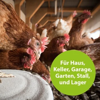 Anwendung gegen die Rote Vogelmilbe im Geflügelstall: Besprühen von Oberflächen. Zur Behandlung von Insekten in Hühnerställen ist die Umgebung zu behandeln. Nicht direkt auf das Geflügel auftragen. Vorbeugend: Anwendung im sauberen und trockenen Geflügelstall vor dem Einstallen der Tiere. Ausreichend Produkt aufsprühen, sodass sämtliche Oberflächen mit einem weißen Film bedeckt sind (ca. 50 g/m²). Bekämpfend: wobei sich die Tiere außerhalb des Geflügelstalls befinden. Ausreichend Produkt aufsprühen, sodass sämtliche Oberflächen mit einem weißen Film bedeckt sind (ca. 50 g/m²). Wenn möglich, direkt auf den Insekten anwenden. Auch Ritzen und Spalten, Hohlräume und Laufwege oder alle anderen Stellen behandeln, an denen sich die Milben verstecken oder eindringen können.