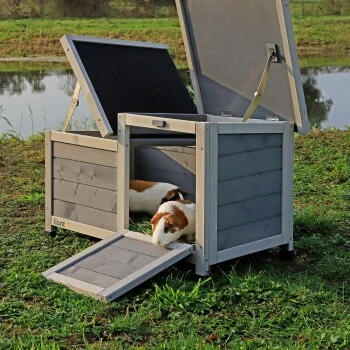 - WETTERFEST. Die beiden wasserfesten Dächer mit Bitumenbelag sorgen für trockene Aufenthalte. Sie sind aufklappbar und ermöglichen somit einen schnelleren Zugang zu Ihrem Tier und erleichtern die Reinigung des Kaninchenstalls
