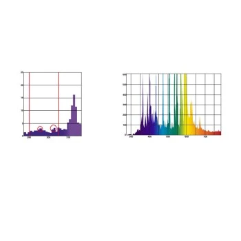 - Das Spektrum verändert sich mit zunehmender Lebensdauer der Lampe. Dieser Effekt ist auch stark abhängig vom verwendeten Vorschaltgerät. Elektronische Vorschaltgeräte bringen im Allgemeinen eine konstantere Leistung als elektromagnetische Betriebsgeräte