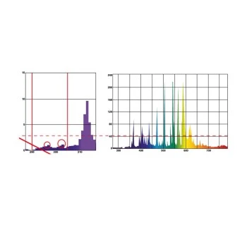 - Das Spektrum verändert sich mit zunehmender Lebensdauer der Lampe. Dieser Effekt ist auch stark abhängig vom verwendeten Vorschaltgerät. Elektronische Vorschaltgeräte bringen im Allgemeinen eine konstantere Leistung als elektromagnetische Betriebsgeräte
