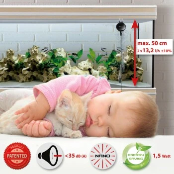 Sie verspricht eine lange Lebensdauer durch hochwertig verbaute Einzelteile, die dadurch auch eine hohe Energieeffizienz aufweisen. Die Leistung der Zweikanal Pumpe beläuft sich auf enorme 2×13 l/h in Bezug auf diese kleine Pumpe. Durch den Saugnapf auf der hinteren Seite der Pumpe lässt sie sich beliebig an glatten Flächen anbringen.
