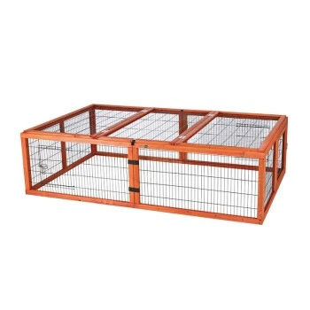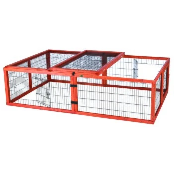 Das Freilaufgehege aus lasiertem Kiefernholz mit pulverbeschichteten Metallgittern ist